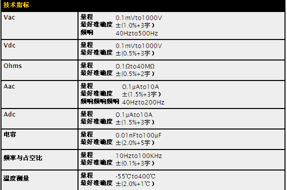 基本直流准确度、4000字显示、自动与手动量程 、显示保持功能 、二极管测试与蜂鸣 、牢固护套、自动关机、易于更换电池设计、一年保修、500小时电池使用时间