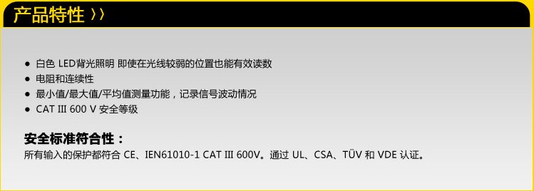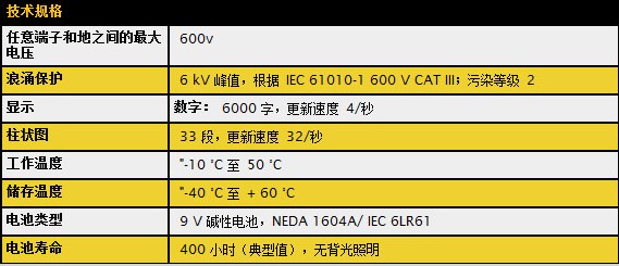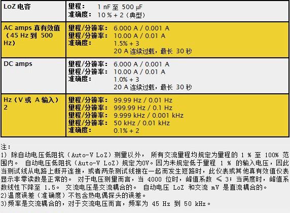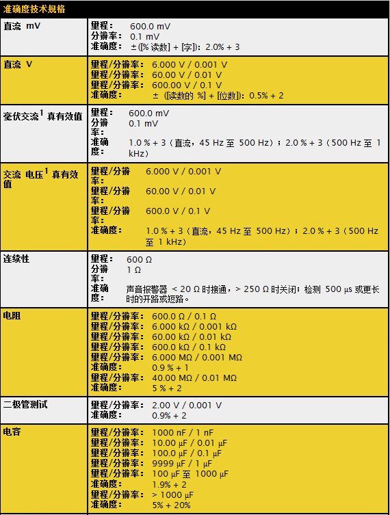 交流电压1真有效值量程/分辨率:6.000V/0.001V 量程/分辨率:60.00V/0.01V 量程/分辨率:600.0V/0.1V 准确度:1.0%+3(直流,45Hz至500Hz);2.0%+3(500Hz至1kHz)