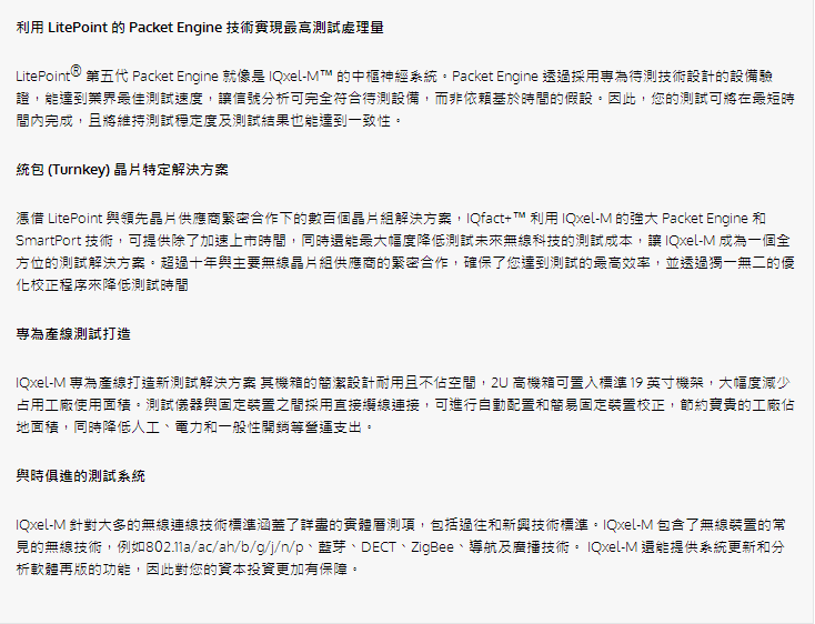 IQxel-M™ 係**一站式 (One-box) 測試解決方案,可滿足您對所有無線連接能力測試的需求。 支援的測試包括: